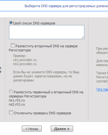 Если же вы по какой-либо причине не знаете адреса или у вас еще нету хостинга то вы можете выбрать один из ниже предложенных вариантов: разместить домен на серверах регистратора или вообще отключить проверку серверов. Более приемлем первый вариант, это и бесплатно и вы сможете сменить адреса после того как купите хостинг или узнаете адреса у технической поддержки.
